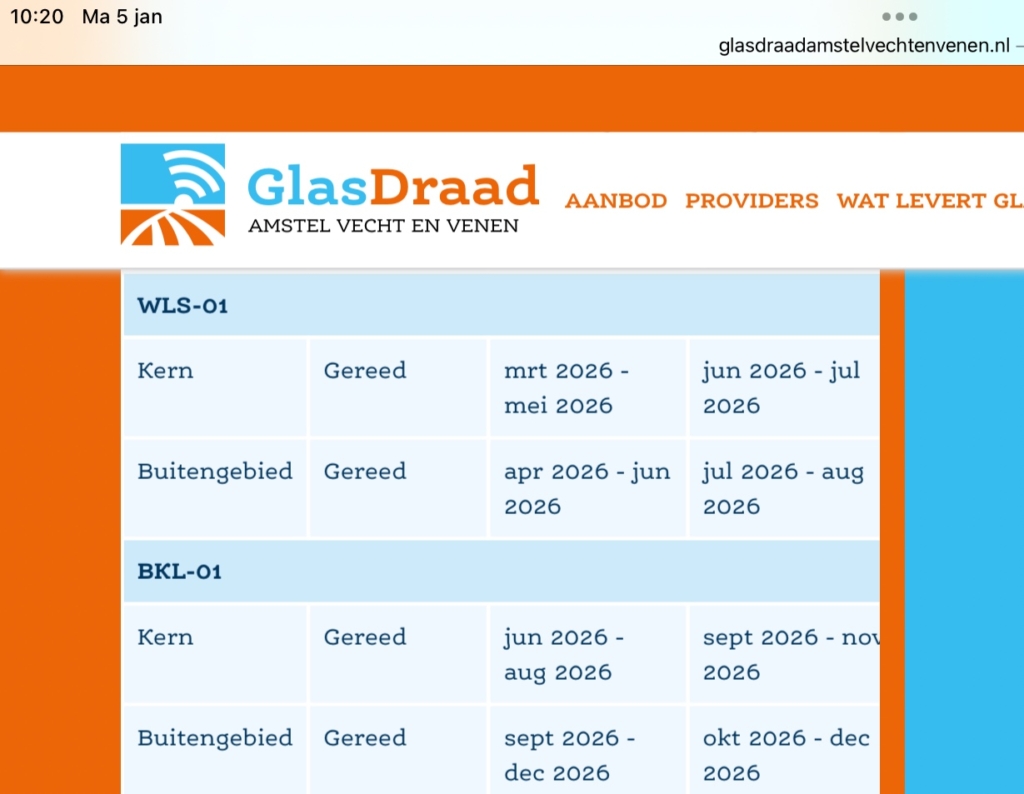Tot nu toe zijn er ogenschijnlijk weinig activiteiten geweest met betrekking tot de glasvezel aansluitingen, maar daar komt dit jaar hopelijk verandering in. Andere gebiedsdelen richting Amstelveen zijn of worden nu aangesloten en de planning voor ons gebied moet in maart tot mei zijn afgerond. Nog heel even wachten dus.